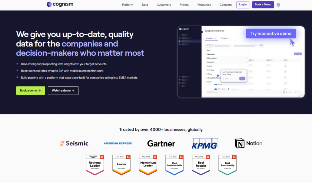 • Data quality and compliance: Cognism stands alone as a B2B contact data provider specifically designed for mid-market and enterprise organizations targeting European markets, offering regional expertise and a self-correcting data engine technology that ensures accuracy.