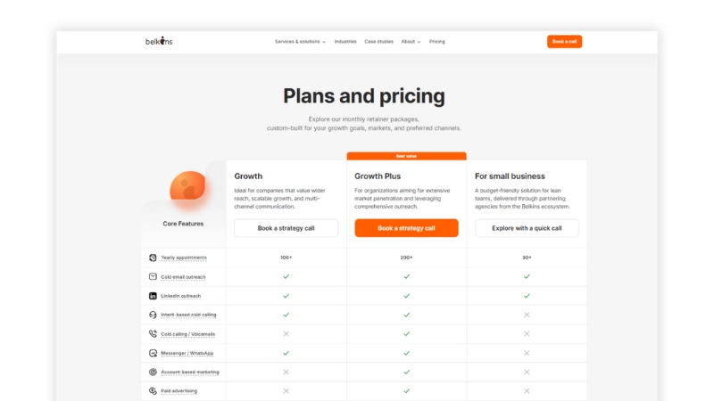 Belkins runs outreach across cold email, LinkedIn, cold calling, and intent-based calling. Their full omnichannel suite also includes account-based marketing, CRM consulting, paid ads, and messaging platforms. In practice, however, the agency’s heritage is email-first, with LinkedIn and calling added as supporting channels.